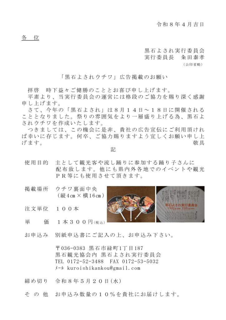 ホーム > お知らせ > 「黒石よされウチワ」広告掲載のお願い 2026年4月16日 「黒石よされウチワ」広告掲載のお願い 本年の「黒石よされ」は、8月14日から18日まで開催されます。祭りの雰囲気をより一層盛り上げるため、「黒石よされウチワ」を作成いたします。 本うちわは、多くの来場者の皆様に配布される予定です。つきましては、この機会に貴社の広告宣伝の場としてぜひご活用いただければ幸いです。 皆様のご協力を心よりお願い申し上げます。 (チラシダウンロード) 申込方法 申込書にご記入の上、お申込みください。 締切 令和8年5月20日(水) お問い合わせ先 黒石よされ実行委員会電話:0172-52-3488 0172-52-4316 -お知らせ -イベント