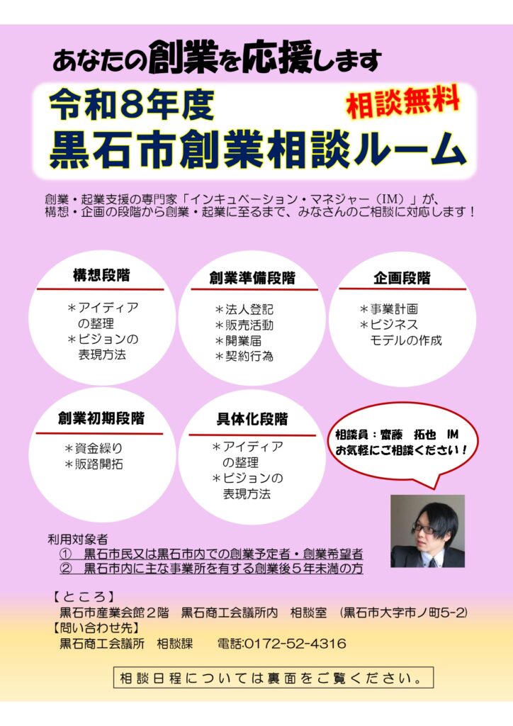 令和8年度 黒石市創業相談ルームのご案内