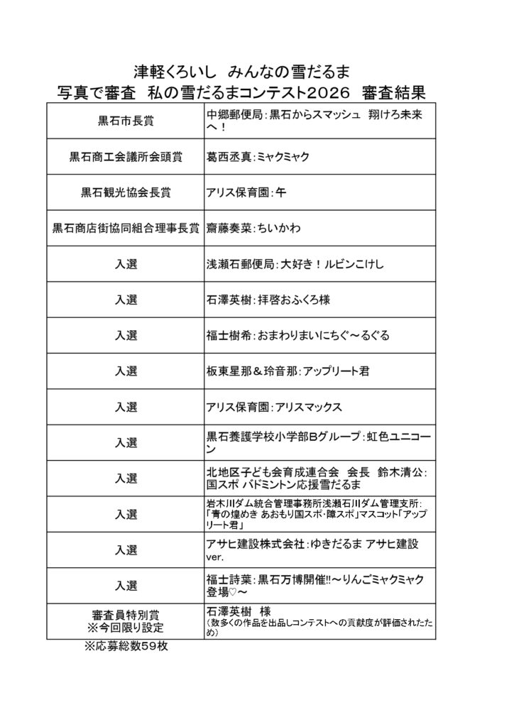 ホーム > お知らせ > 津軽くろいし みんなの雪だるま 写真で審査 私の雪だるまコンテスト2026 結果発表 2026年3月2日 津軽くろいし みんなの雪だるま写真で審査 私の雪だるまコンテスト2026 結果発表 私の雪だるまコンテスト2026の審査結果を発表いたします。今年も皆様のご応募、誠にありがとうございました。 -お知らせ -イベント