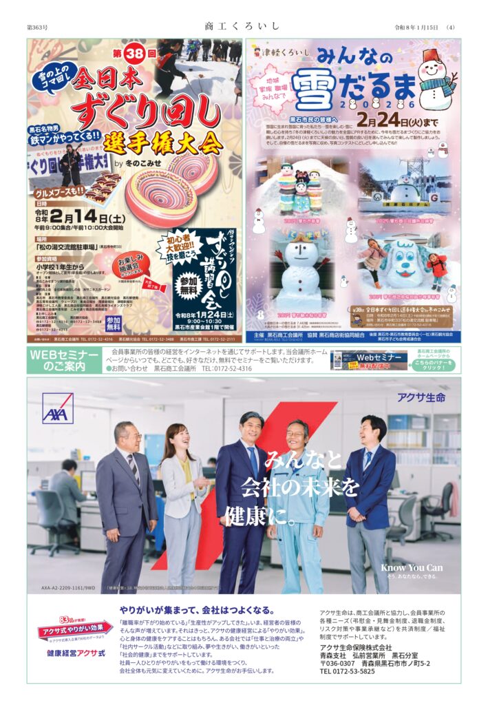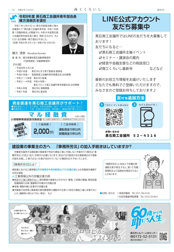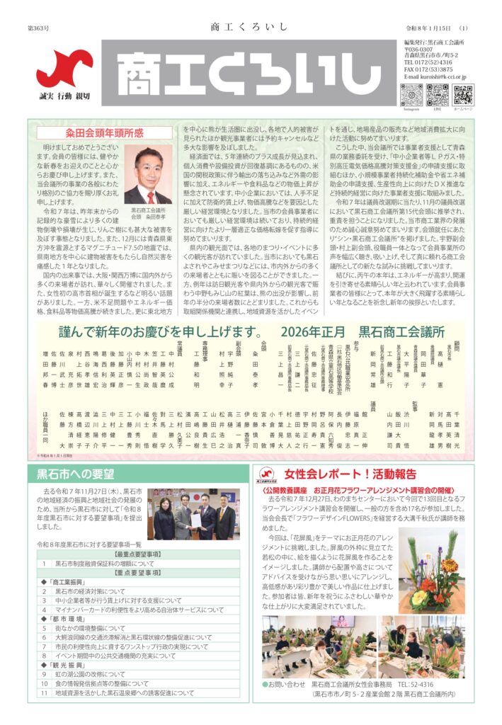 黒石商工会議所では、地域の事業者の皆様に地域経済の状況や各種補助金・セミナーなどの耳よりな情報を届けるべく、2~3ヵ月ごとに会報紙『商工くろいし』を発行しています。