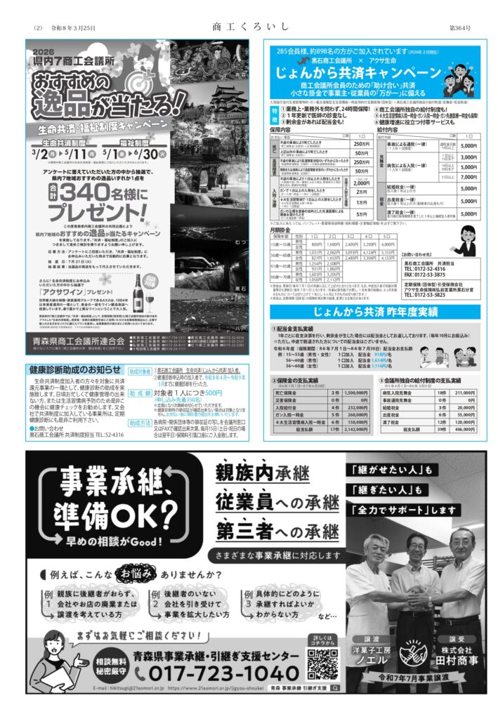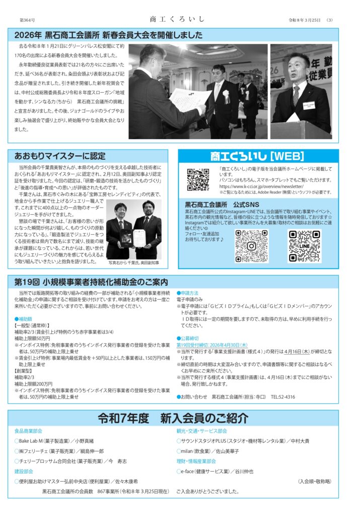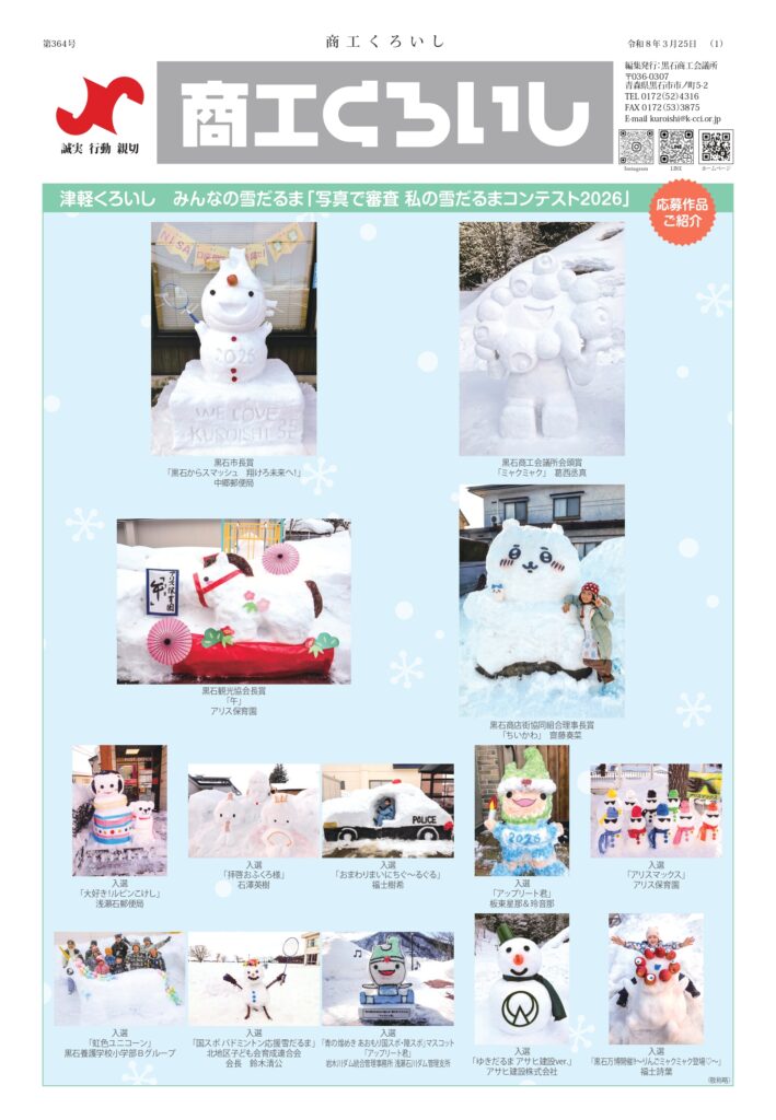 黒石商工会議所では、地域の事業者の皆様に地域経済の状況や各種補助金・セミナーなどの耳よりな情報を届けるべく、2~3ヵ月ごとに会報紙『商工くろいし』を発行しています。