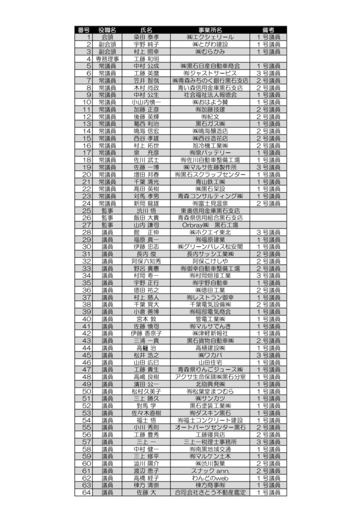 ホーム > 黒石商工会議所について > 黒石商工会議所各種データ > 役員・議員 黒石商工会議所について 会頭あいさつ商工会議所とは黒石商工会議所の沿革入会について商工くろいし事務受託団体- 黒石地区雇用対策協議会- 黒石市中心市街地活性化協議会黒石商工会議所各種データ- 役員・議員- 要望活動・要望事項- 特定個人情報保護方針 黒石商工会議所 役員・議員名簿 令和7年11月1日現在 2025年11月7日 author